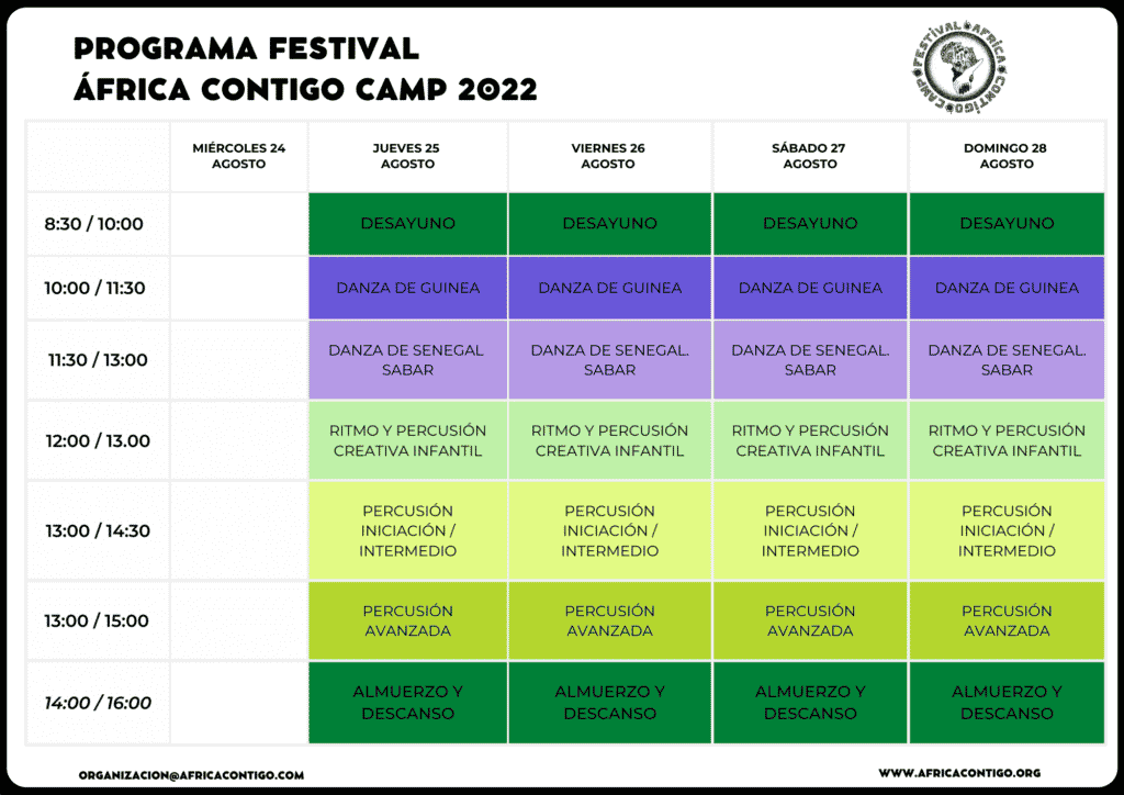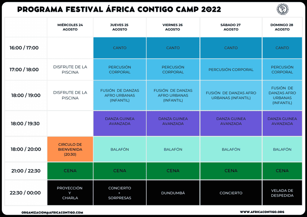 No te pierdas ningún evento de nuestro festival. Desde el 24 al 28 de agosto tendrán lugar actividades para todos los públicos de danzas de África del Oeste, percusión, talleres infantiles, mercadillo, conciertos, proyección, convivencia, gastronomía africana. En un enclave en medio de la montaña que te trasladará directamente a alguna región del continente africano. En el Complejo Rural Puerto Peñas, en el municipio de Aroche (Huelva).
